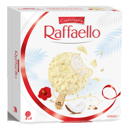 Découvrez le plaisir exotique de Raffaello dans une délicieuse glace saveur noix de coco recouverte d’un enrobage aux éclats d’amandes et noix de coco râpée.