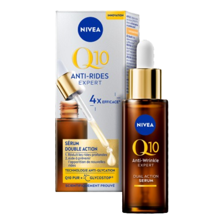 Le Sérum Double Action Q10 dévoile une nouvelle technologie anti-glycation, grace à l'association de Q10 Pur et de GLYCOSTOP. Il réduit les rides et profondes et prévient leur apparition.