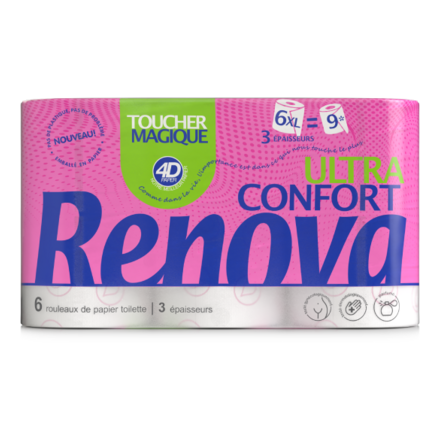 Découvrez Toucher Magique ULTRA CONFORT, le papier toilette 3 plis signé Renova, pensé pour allier bien-être, résistance et raffinement. Chaque passage devient un instant de confort et de fraîcheur.
