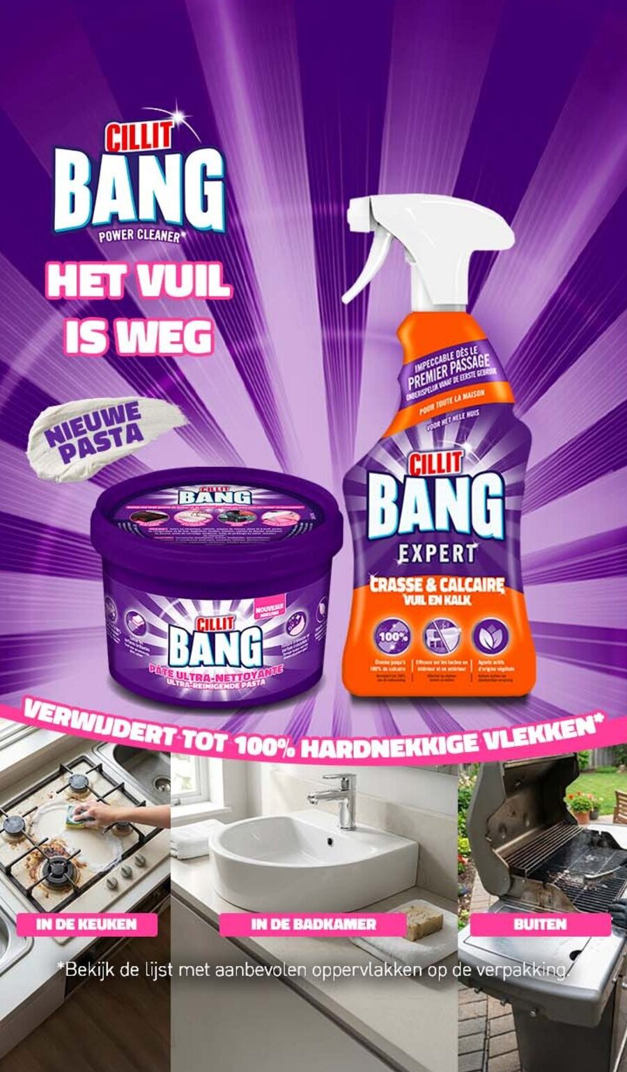Cillit Bang Ultra Reinigende Pasta: uw nieuwe bondgenoot voor het schoonmaken van uw hele huis! Het reinigt grondig, zelfs op verticale oppervlakken. Dankzij de vele mogelijkheden kan het zowel binnen (keuken, badkamer, enz.) als buiten worden gebruikt.