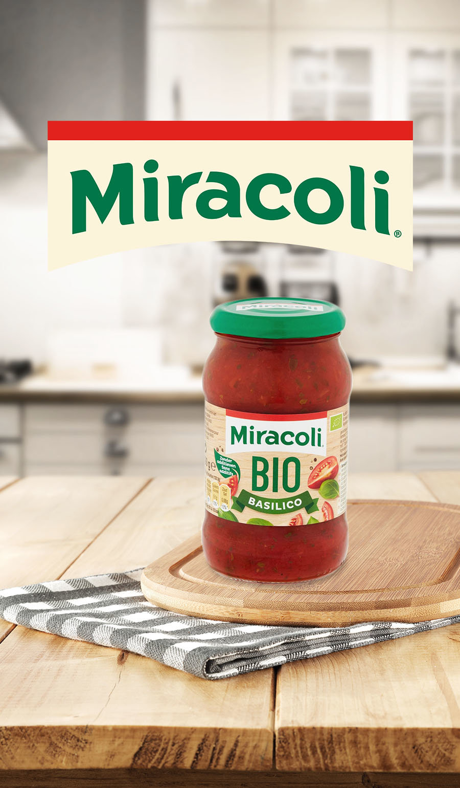 Natuurlijk lekker, natuurlijk biologisch: ons recept Basilico, boordevol tomaten, basilicum en andere 100% biologische groenten, maar nog steeds met die unieke Miracoli-smaak en geheime kruidenmix.