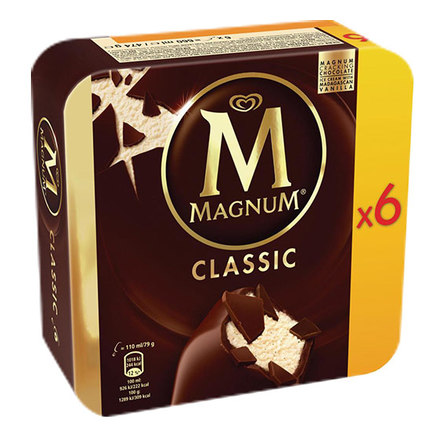 Je vindt het fluweelzachte vanille-ijs van de Magnum Classic verpakt in een laag intens krakende Magnum chocolade, in een laag knisperende Magnum melkchocolade met stukjes amandel of in een laag krakende witte Magnum chocolade.
