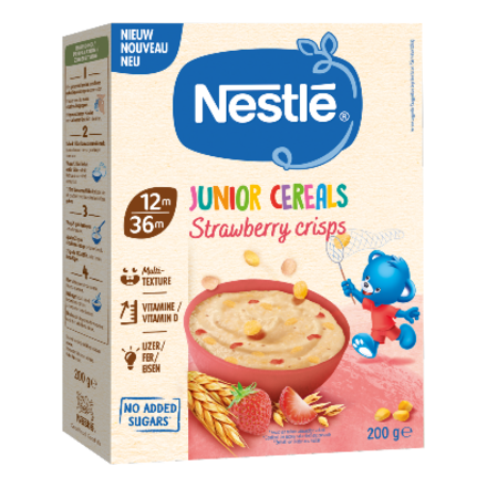 Bij het ontbijt geeft NESTLE JUNIOR CEREALS jouw bengeltje een lekker voedzaam begin van de dag, boordevol granen en stukjes fruit. Verrijkt met ijzer en vitamine D, zijn ze geschikt voor kinderen vanaf 12/15 maanden.