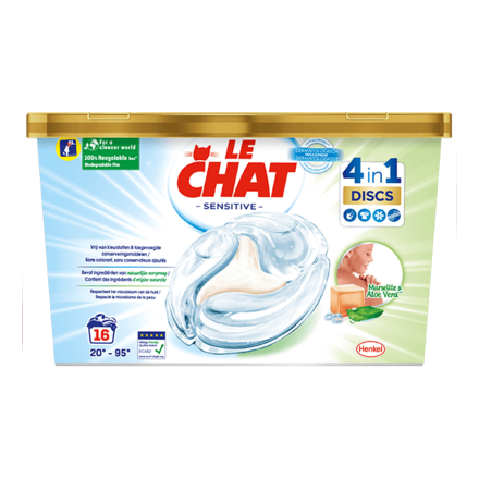 Ontdek de nieuwe generatie capsules voor Le Chat. De eerste Le Chat-capsules met 4 compartimenten speciaal ontworpen voor de gevoelige huid: de hypoallergene* parfumformule met ingrediënten van natuurlijke oorsprong is dermatologisch getest. Le Chat Discs zijn ontworpen om een schone was te garanderen met respect voor het microbioom van de huid*. Bovendien is de verpakking milieuvriendelijk, dankzij de recycleerbare doos.