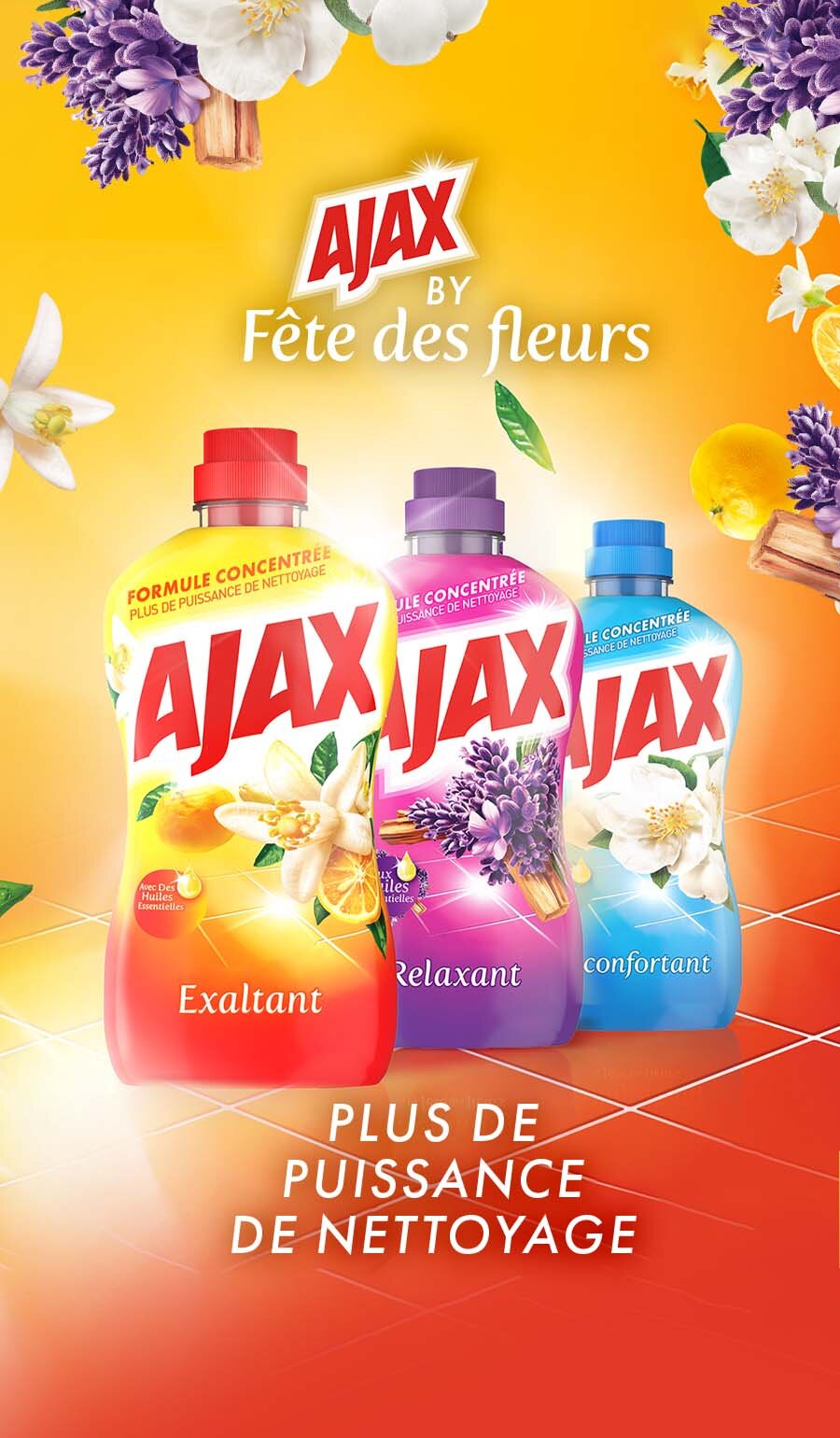 Nettoyez et élevez vos sens avec la nouvelle gamme de nettoyants multi-usages Ajax by Fête des Fleurs. Sa formule concentrée offre 2 fois plus d'efficacité et de parfum, pour un intérieur éclatant après chaque utilisation. Grâce à sa nouvelle technologie Mood Boosting, enrichie en huiles essentielles, cette gamme a été conçue pour stimuler l’humeur et transformer chaque moment de nettoyage en une expérience sensorielle unique.