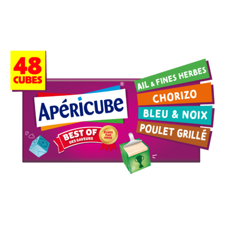 Apéricube, l’incontournable de l’apéritif, avec ses 48 cubes fromagers savoureux en portions, parfaits pour un apéro convivial.