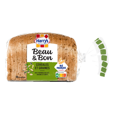 Tranche de pain de mie au blé français .bien garnie en graines et céréales très bon nutri-score :a. se conserve longtemps