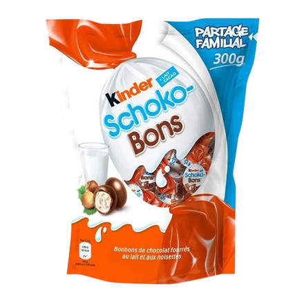 Kinder Schoko-Bons, c'est un bonbon de chocolat qui procure un vrai plaisir gourmand aux enfants comme aux adultes grâce à sa recette unique qui allie le bon goût du chocolat KINDER, un cœur au lait fondant et des éclats de noisettes croquantes. Idéal pour partager en famille ou entre amis, Kinder Schoko-Bons, c'est la petite touche de plaisir gourmand qui rend les moments de partage en famille et entre amis encore plus joyeux !