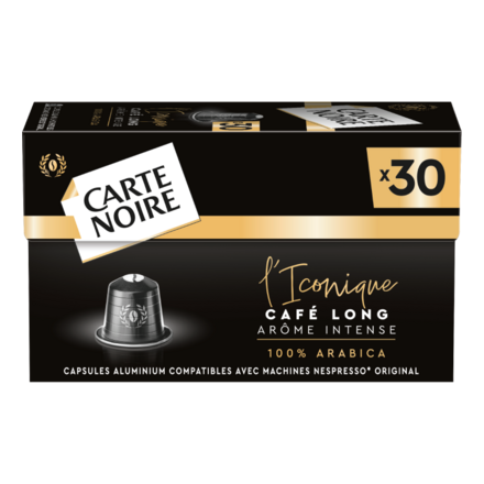 L'iconique, c'est le café d'exception Carte Noire au goût unique et à l'arôme intense, en capsules aluminium. Retrouvez tout l'héritage Carte Noire dans votre café long Pur Arabica L'Iconique.