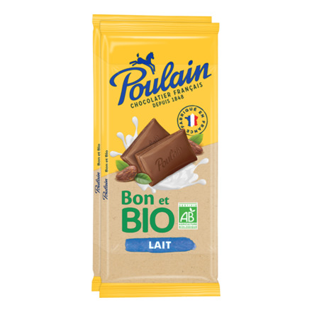 Découvrez la tablette de chocolat Poulain Lait Bon & Bio, une délicieuse tablette de chocolat au bon lait bio, fabriquée en France, avec 100% des ingrédients issus de l'agriculture biologique.