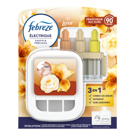 Febreze 3Volution combat les odeurs en continu et alterne entre 3 parfums complémentaires pour une fraîcheur qui dure jusqu’à 90 jours (utilisation 12 h/jour à réglage minimum).