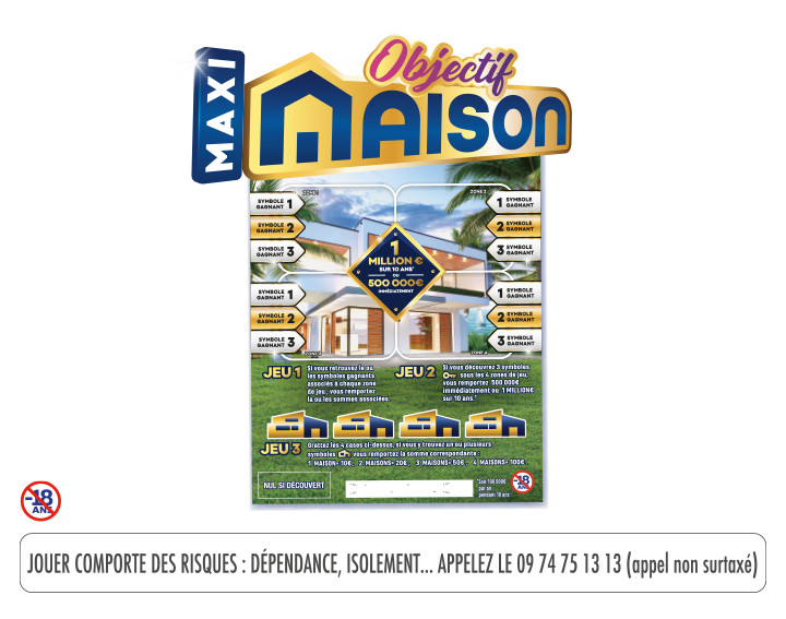 Opération promotionnelle organisée par La Française des Jeux et réservée aux personnes physiques majeures. Toute demande de remboursement est limitée à une par personne (même nom, même prénom, même date de naissance et même adresse email). Toute participation implique l’adhésion au règlement du jeu de grattage « Maxi Objectif Maison » disponible sur fdj.fr. Remboursement de 2,00€ pour l’achat dans les points de vente FDJ d’un ticket « Maxi Objectif Maison » d’une valeur de 5,00€, ayant le code jeu 145, émission n°01, selon les modalités de remboursement de Shopmium. Demande recevable à compter du 10/10/2022 à 10:00 et dans la limite de 23 000 demandes.