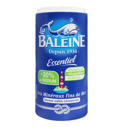 La gamme La Baleine Essentiel c'est -30% de sodium par rapport à un sel de table, mais un goût salé préservé. Le sodium est remplacé par des minéraux marins bénéfiques pour l'organisme (potassium, magnésium, calcium). Vous pouvez utiliser les sels La Baleine Essentiel pour toutes vos préparations culinaires, à la fois en cuisine et à table.