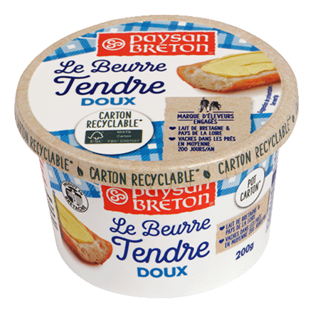 Fini le beurrier en plastique ! Retrouvez les beurres doux et demi-sel Paysan Breton dans un pot rond en carton*, pratique et recyclable.