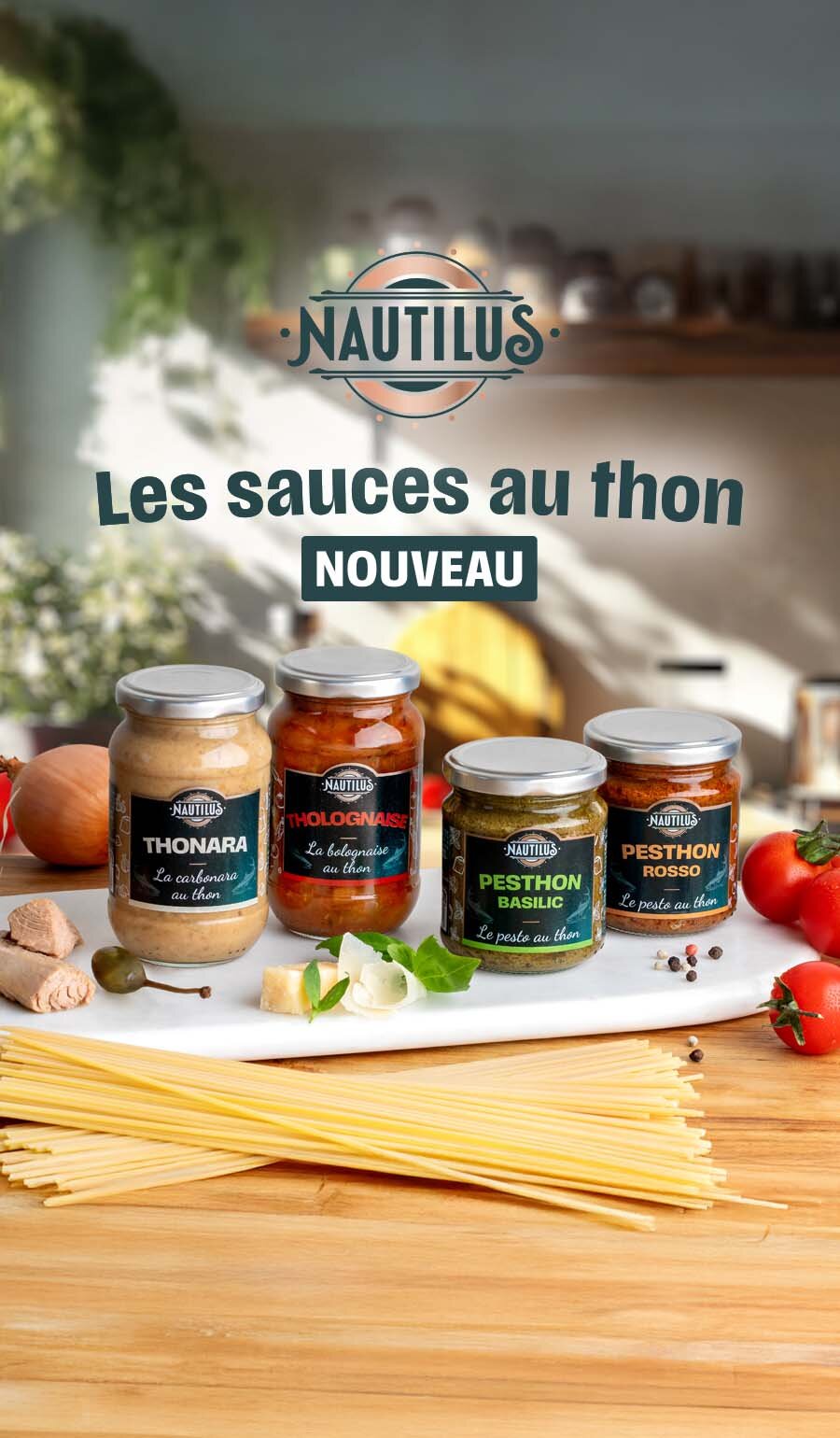 Découvrez cette toute nouvelle vague de saveur : les sauces au thon Nautilus ! Ces recettes, dont les ingrédients ont été soigneusement choisis, ont été élaborées avec le chef Justin Brohm pour un résultat délicieux ! Vous retrouverez de vrais morceaux de thon, de carottes, de tomates, du basilic, de l’huile d’olive et bien d’autres ingrédients qui en font des sauces savoureuses. De plus, avec au minimum 20% de thon, ces recettes sont riches en protéines et en oméga 3 !