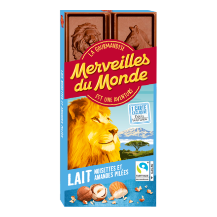 La finesse d’un délicieux chocolat au lait fondant aux noisettes et amandes pilées, de grands carreaux ornés d'animaux dans lesquels croquer avec gourmandise et une nouvelle collection de cartes animaux à découvrir. Une bouchée qui vous replongera dans vos souvenirs d’enfance les plus gourmands, et de nouvelles recettes à découvrir sans attendre.