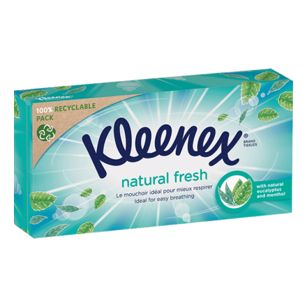 Le mouchoir Kleenex® Natural Fresh a été spécifiquement développé avec des extraits naturels d’eucalyptus et de menthol pour libérer et décongestionner le nez, laissant ainsi une agréable sensation de fraîcheur.