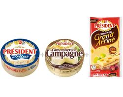 Donnez du goût à vos plateaux de fromages avec le Camembert de campagne Président, Président Le Bleu, la Bûche Président St Varent et l'Emmental Président Grand Affiné !