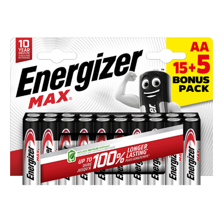 Les produits de la gamme Energizer Max sont nos piles qui durent jusqu'à 100% plus longtemps* ! Fabriqués à partir de matériaux recyclés** et dans des emballages 100% recyclables et sans plastique***, nos piles Max sont l'idéal pour vos produits du quotidien.