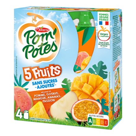 Découvrez Pom'Potes® 5 fruits, des mélanges inédits pour un goût intense et vraiment différent ! Des recettes sans sucres ajoutés* élaborées à partir de pommes origine France et issues de vergers écoresponsables.