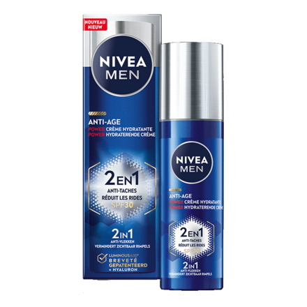 Découvrez l'innovation Anti-Âge NIVEA MEN : la crème visage POWER 2en1 Anti-Âge et Anti-Taches. L'ingrédient breveté LUMINOUS 630® réduit l'apparence des taches brunes, et combiné à l'action de l'acide hyaluronique, votre peau paraît plus jeune en seulement 4 semaines*. Grâce à sa protection solaire SPF30, cette crème visage permet également de prévenir l'apparition des nouvelles taches brunes et des rides. *Auto-évaluation (score), 64 hommes, 2022.