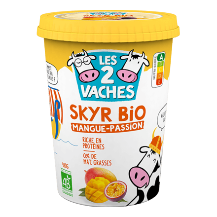 Découvrez notre nouveau Skyr Bio Mangue Passion Les 2 Vaches à la texture onctueuse. Une nouvelle recette gourmande aux fruits exotiques, riche en protéines et sans matières grasses (Nutri-score A). Et pour faire toujours Meuh, nouveau pot en carton recyclable !
