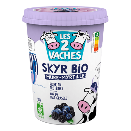 Découvrez notre nouveau Skyr Bio Mûre Myrtille Les 2 Vaches à la texture onctueuse. Une nouvelle recette gourmande aux fruits des bois, riche en protéines et sans matières grasses (Nutri-score A). Et pour faire toujours Meuh, nouveau pot en carton recyclable !