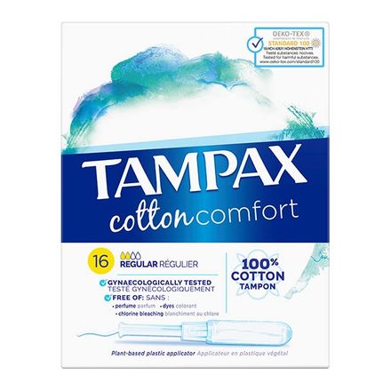 Découvrez Tampax Cotton Comfort, des tampons 100% coton, sans parfum ni colorant, avec un applicateur en plastique végétal.