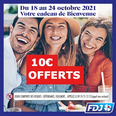Opération promotionnelle réservée aux personnes majeures, n'ayant pas de compte FDJ et n'étant pas interdit de jeu, organisée par la Française des Jeux. Offre non cumulable avec toute autre offre promotionnelle, non réutilisable, non échangeable. Offre valable jusqu'au 24 octobre 2021, 23h59 (date et heure métropolitaines).