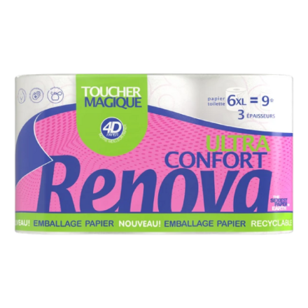 Découvrez Toucher Magique ULTRA CONFORT, le papier toilette 3 plis signé Renova, pensé pour allier bien-être, résistance et raffinement. Chaque passage devient un instant de confort et de fraîcheur.