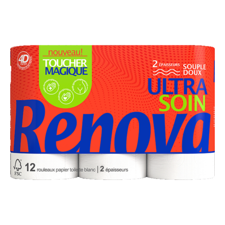 Découvrez Toucher Magique ULTRA SOIN, le papier toilette le plus apprécié de la gamme Renova, conçu pour offrir un équilibre parfait entre confort, soin et accessibilité. Sa texture soyeuse et sa résistance en font le compagnon idéal pour une hygiène irréprochable, jour après jour.