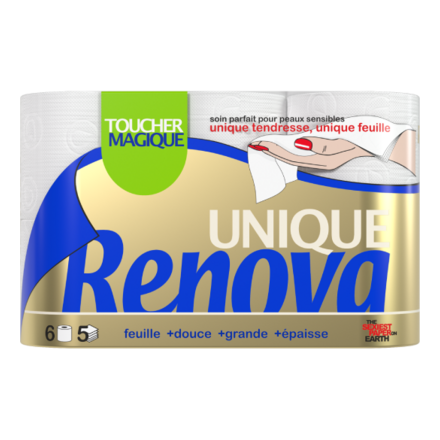 Découvrez Toucher Magique UNIQUE, le papier toilette 5 plis signé Renova, conçu pour offrir un équilibre parfait entre douceur, épaisseur et solidité. Chaque feuille XXL assure un confort inégalé, pour une sensation de propreté et de soin à chaque utilisation.