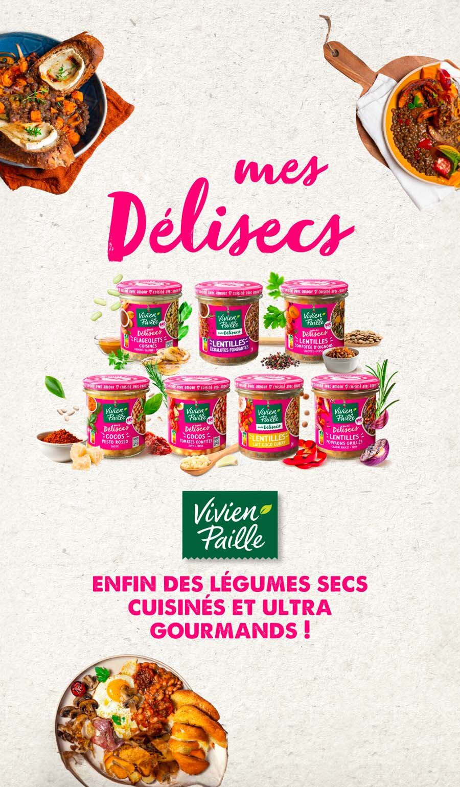 Chez Vivien Paille, on est convaincu que les légumes secs sont vos meilleurs alliés : ils sont bons 4 fois : pour la santé, pour la planète, pour votre budget et pour vos papilles ! Et parce qu’on est sympas, on a décidé de vous les faire redécouvrir de manière fun et gourmande ! Encore mieux que des kilos de popcorn devant un film, place aux Délisecs : coco pesto rosso, lentilles compotées aux oignons, flageolets cuisinés… Un festival de saveurs pour régaler vos papilles !