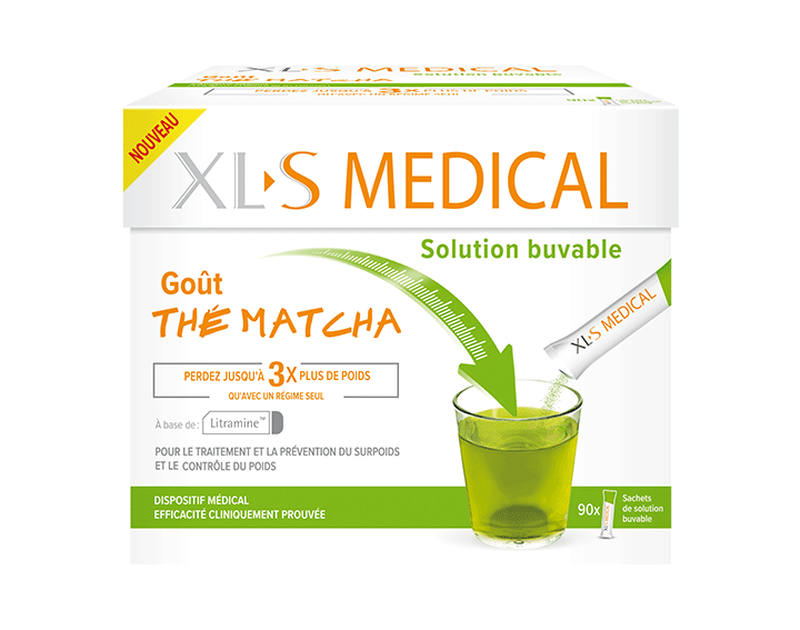 Xl-S Medical Solution buvable goût thé matcha contient de la litramine®, un complexe breveté de fibres végétales d'origine naturelle, cliniquement prouvé par sa capacité à capter les graisses alimentaires. Son goût et sa couleur verte caractéristique proviennent du MATCHA japonais haut de gamme, l'une des formes les pures de thé vert. Perdez jusqu'à 3X plus de poids qu'avec un régime seul*. Dispositif médical pour le traitement et la prévention du surpoids*. Ce dispositif médical est un produit de santé réglementé qui porte, au titre de cette réglementation, le marquage CE. Uniquement recommandé aux adultes ayant un IMC > 18,5. Avec la prise d’XL-S Medical, nous recommandons de boire une quantité suffisante d’eau dans la journée (2 L). Lire attentivement les instructions de la notice. Demandez conseil à votre pharmacien.*Grube B. et al. 2013, « A Natural Fiber Complex Reduces Body Weight in the Overweight and Obese: A Double-Blind, Randomized, Placebo-Controlled Study » ; Obesity, 21 : 58 – 64, n=125 sujets, doi : 10.1038/oby.2012.165. Etude clinique de 12 semaines sur 81 sujets (25 < IMC moyen < 30), Perte de poids moyenne : 3.6kg vs 0,9kg dans le groupe placebo.Ed: Nov 2020