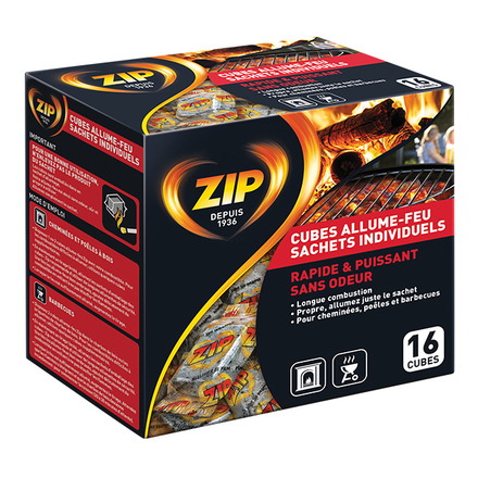 Zip a fabriqué son premier allume-feu en 1936. Aujourd'hui, nos produits de très haute performance vous procureront un allumage de feu plus facile que jamais. Les allume-feux Zip ont été developés pour s'allumer facilement, du premier coup et à chaque fois. Ils brûlent longtemps ce qui vous permet d'allumer les combustibles les plus difficiles et d'utiliser moins de cubes pour un meilleur rapport qualité-prix.