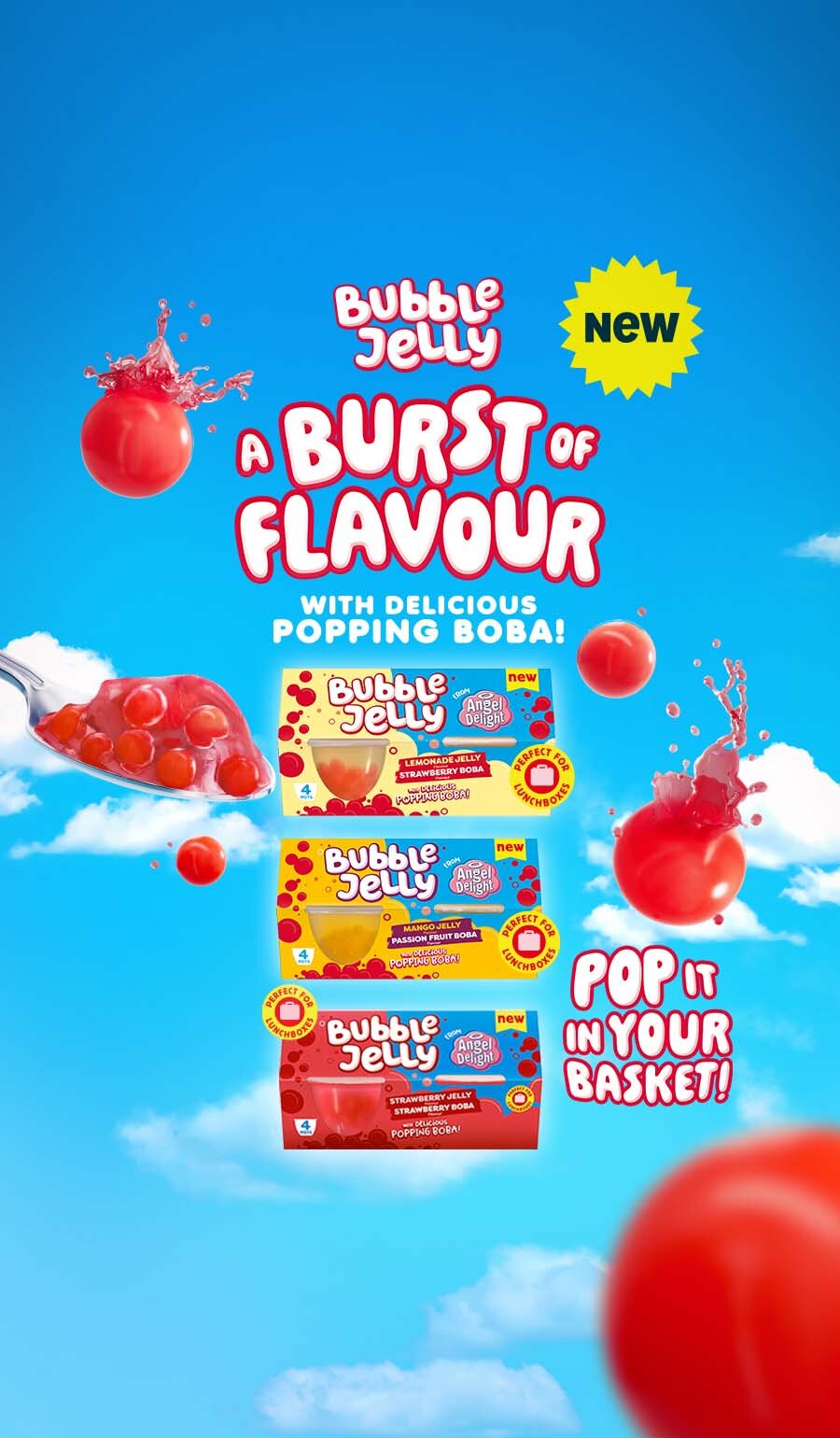 New Angel Delight bubble jelly combines the joyful jigglyness of jelly, with a Bubble Tea inspired twist - delicious popping boba pearls – there’s a burst of flavour in every bite!