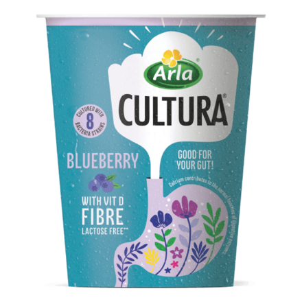 Our Arla Cultura® blueberry gut health yogurt has a unique combination of 8 bacteria cultures, calcium, vitamin D, protein and fibre. This diverse blend makes a deliciously creamy fruity addition to your everyday diet that is good for your gut* It is also lactose free**