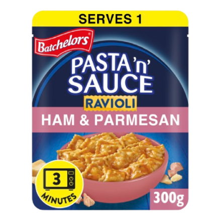 - Batchelors Pasta n Sauce ravioli microwave meal ham & parmesan 300g (£3.00)