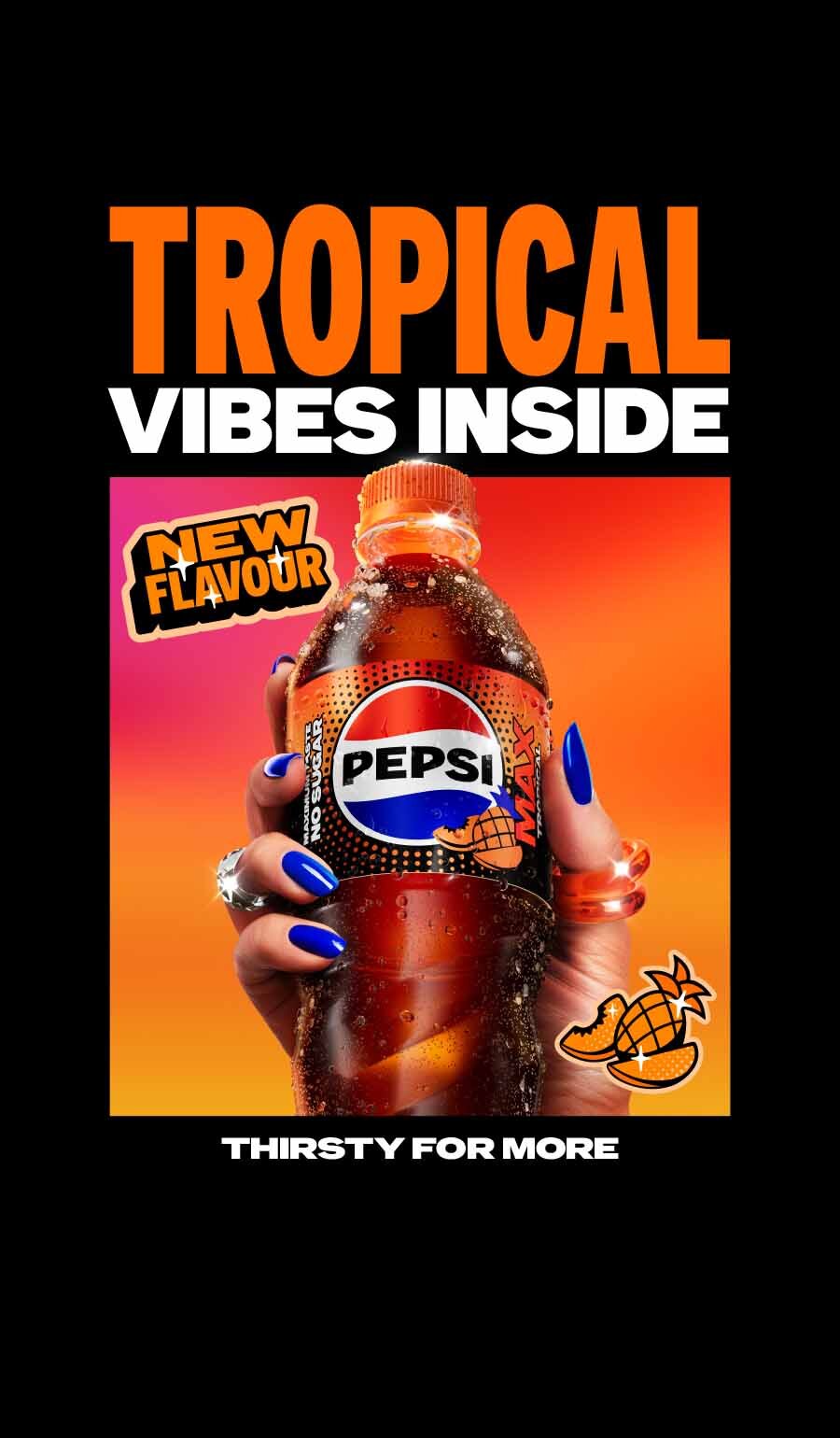 Introducing new Pepsi MAX Tropical— made from pineapple, mango and peach, we're bringing a bold and exotic twist to flavoured cola. When you're feeling the vibe, turn it tropical.