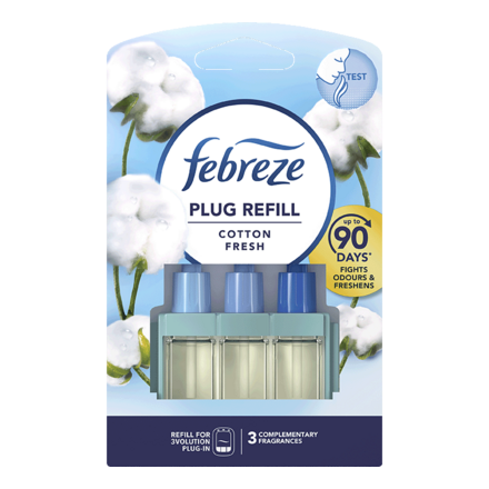 Febreze 3Volution Plug-In continuously fights odours and alternates between 3 complementary scents for freshness you keep noticing. Lasts up to 90 days (if used 12h per day on low setting).