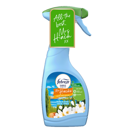Febreze Mrs Hinch's Vacay Vibes Edition with Odourclear technology fights tough lingering odours trapped in fabrics, to leave nothing but a light fresh scent. Febreze Fabric Refreshers are a breath of fresh for fabrics that are hard to wash, like sofa coverings, curtains and carpets. Febreze Fabric Refreshers are dermatologically tested and safe to use around cats and dogs. Try also Febreze 3volution Plugs, continuously fighting odour up to 90 days.