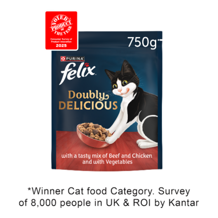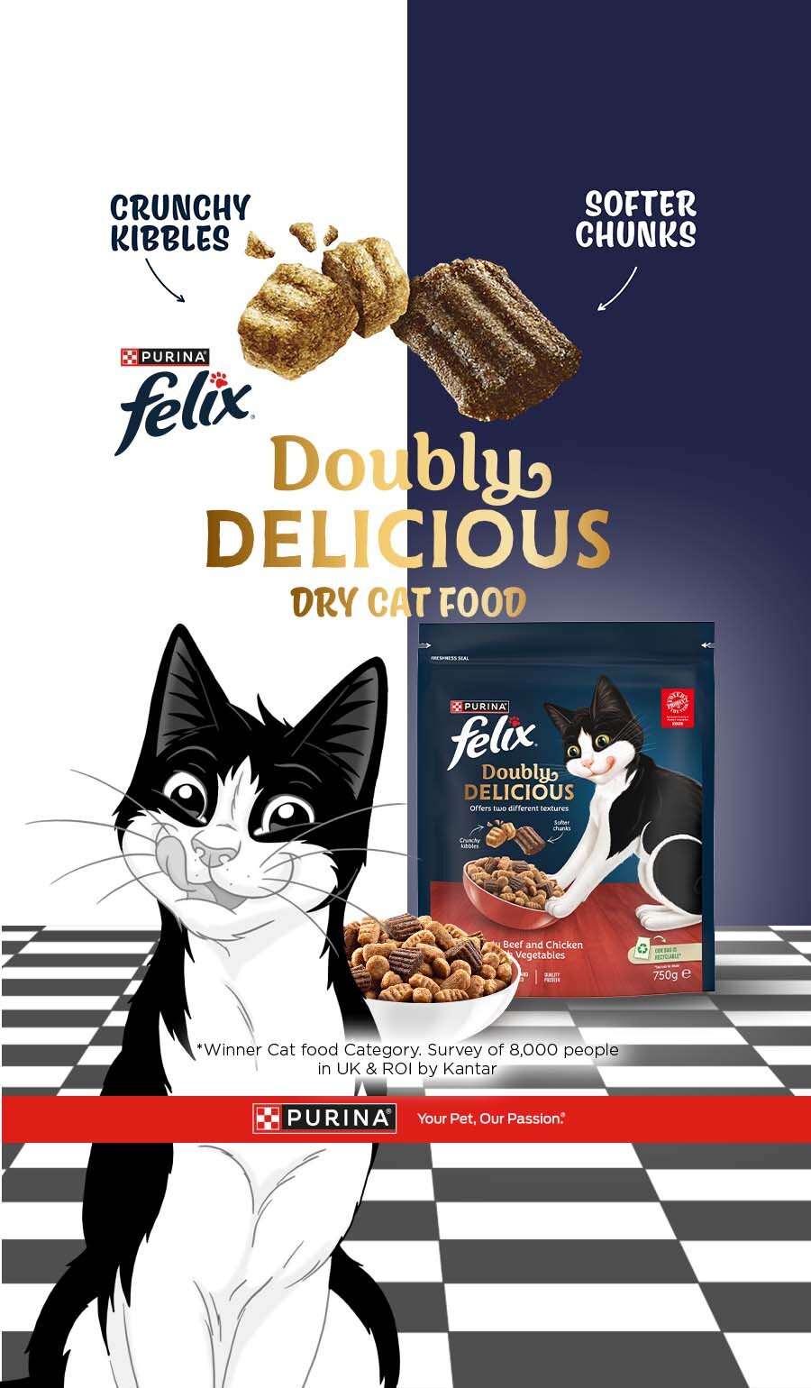 FELIX® Doubly Delicious Dry, a delectable range of meals that will captivate your cat's senses with an enticing combination of delicious crunchy kibbles and softer, more tender chunks. Prepare for a feast of flavours and textures that your cat will absolutely adore!