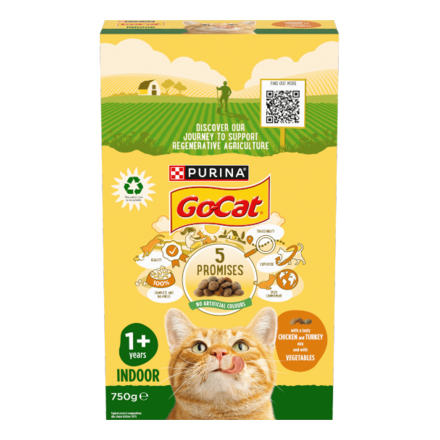 - PURINA GO-CAT Indoor for Indoor cats with a Chicken and Turkey tasty mix and with Vegetables Dry Cat Food 750g (£3.11)