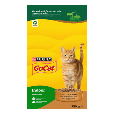 - PURINA GO-CAT® Indoor with a tasty Chicken & Turkey mix and with Vegetables Dry Cat Food 750g (£3.11)