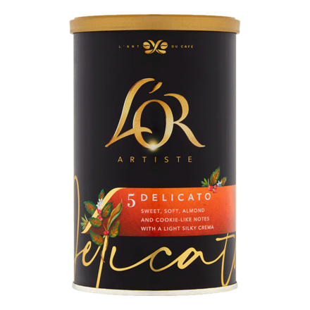 L’OR Artiste Delicato instant coffee blended with finely ground roast coffee delivers luxurious taste nuance and complexity, in the convenience of an instant. A light-gold silky crema gives way to sweet, soft almond aromas and cookie-like taste notes, with a velvety aftertaste. Nuanced, but delightfully appealing.