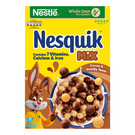 Nesquik cereal provides a fun breakfast with the delicious chocolate crunch that the whole family love . Inspired by our delicious beloved Nesquik Milkshake Mix chocolate drink to create this tasty Nesquik cereal, just add milk to your bowl of Nesquik® Cereal and watch the milk turns chocolatey! It is also high in fibre, wholegrain is the No.1 ingredient, and has the goodness of vitamins and minerals to support a healthy and balanced diet. It’s a source of Calcium and Vitamin D for normal growth and development of bones in children, Vitamin B6 and B3 for contributing to normal psychological functions, Vitamin B5 for contributing to normal mental performance and Iron for contributing to normal cognitive development of children and has no artificial colours or flavours. Enjoy Nesquik chocolate cereals as part of a nutritious breakfast for a tasty start to the day.