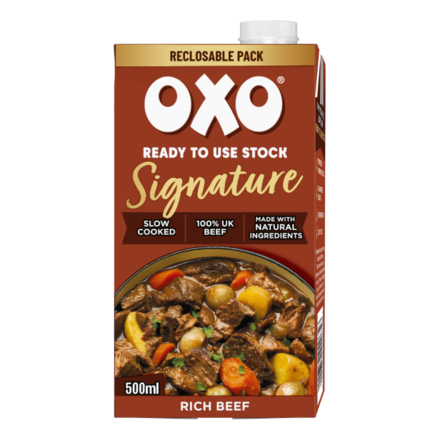 - Oxo Ready To Use Stock Signature Rich Beef 500ML (£2.50)