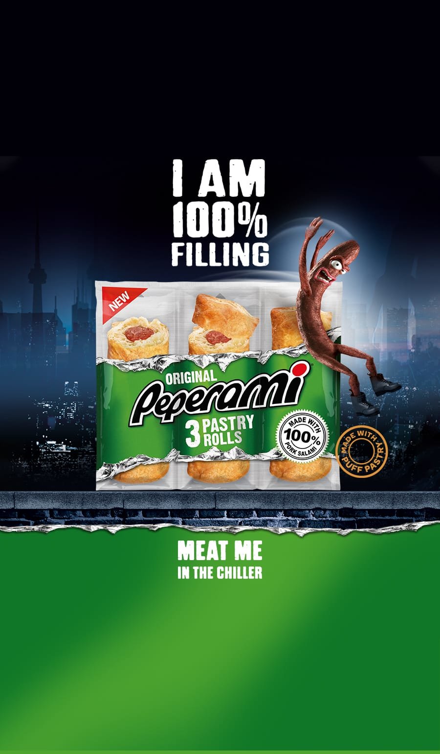 Satisfy your hunger needs with Peperami pastry roll! Made with 100% pork salami and wrapped in a delicious puff pastry, it's the perfect ready to eat snack. 100% filling!