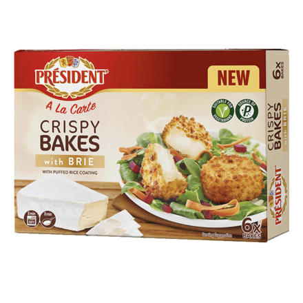Président Crispy Bakes are deliciously gooey cheese bakes filled with a rich Brie cheese filling and coated in crispy puffed rice. They are perfect as a tasty snack or as a convenient side for lunch. So quick and easy to prepare: simply fry Président Crispy Bakes in a pan for 4 minutes each side or bake them for 6 minutes until golden and crispy.
