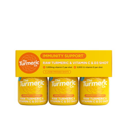 The Turmeric Co Raw Turmeric VIT C&D3 60ml 3 x MP Enjoy as part of a varied, balanced diet and healthy lifestyle. Raw Turmeric Vitamin C & D3 is formulated to support your immunity and energy. This fruity all-in-one solution is delivered through our Lipoturm©